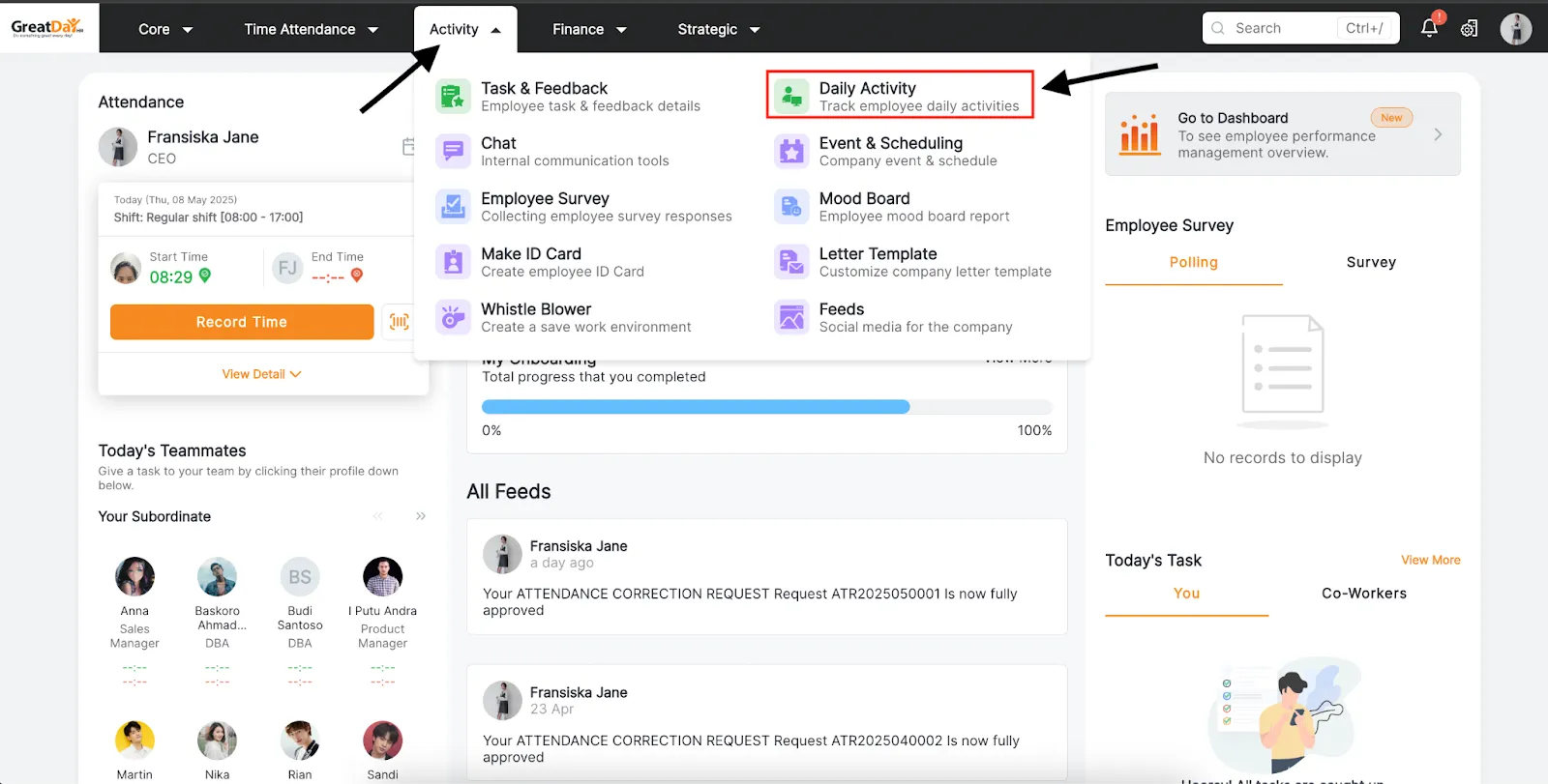 Misalnya pada saat onboarding, karyawan bisa langsung mengisi data-data mereka lewat aplikasi.