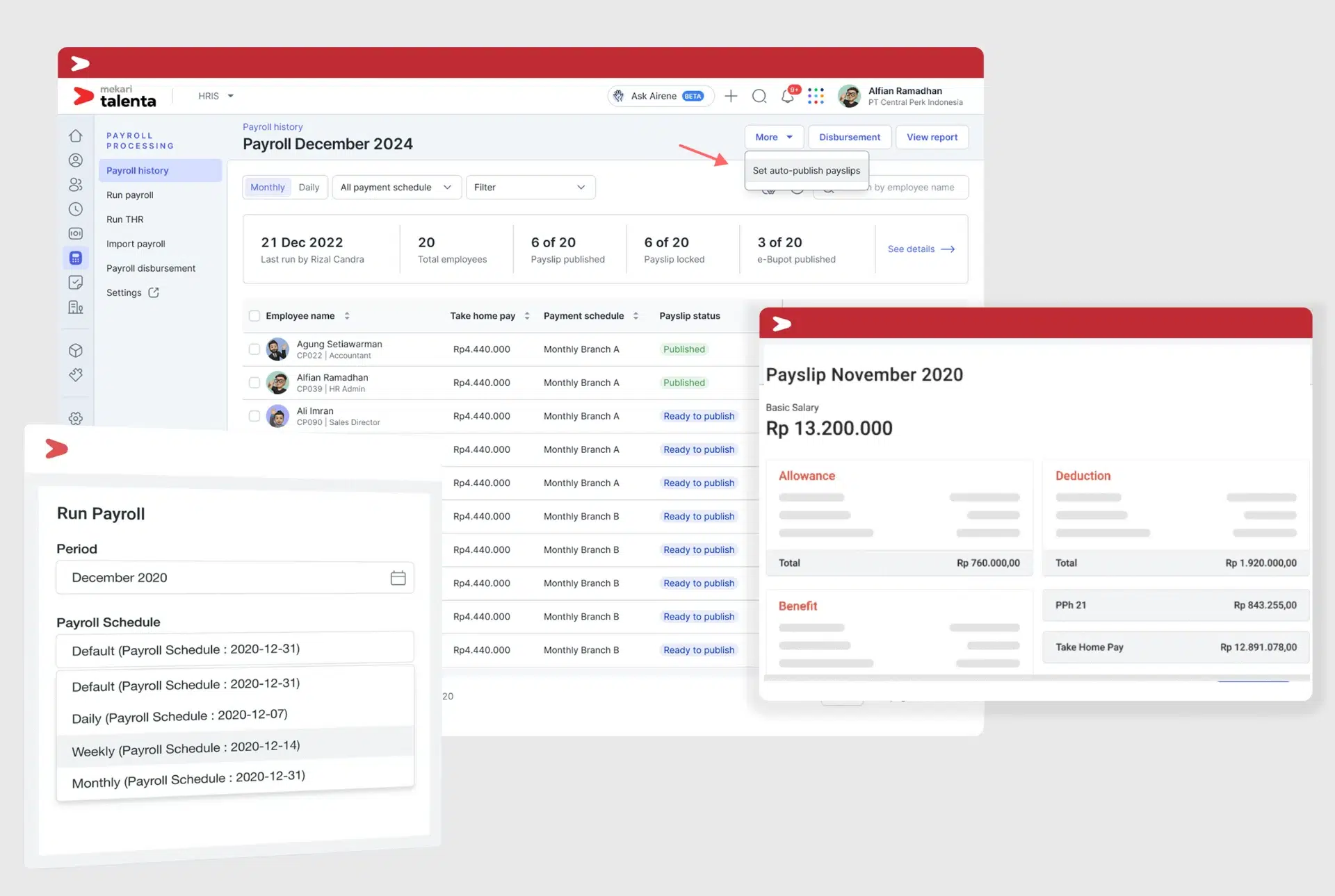 - Terintegrasi langsung dengan payroll, absensi, cuti, dan pajak Indonesia.
