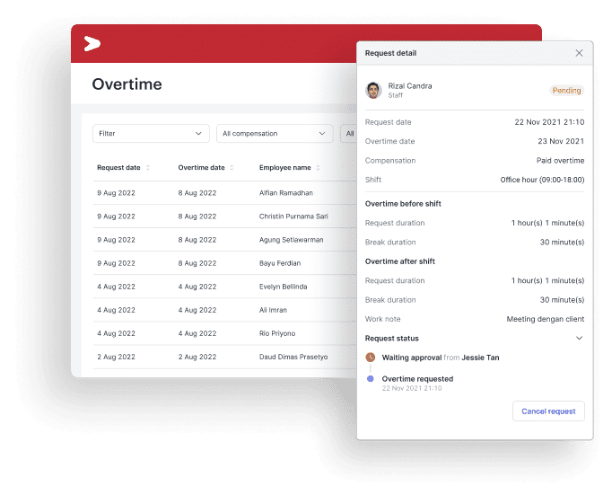 - Perhitungan Gaji Otomatis: Mengintegrasikan data lembur langsung ke dalam sistem penggajian, memastikan payroll lembur yang akurat tanpa perhitungan manual.