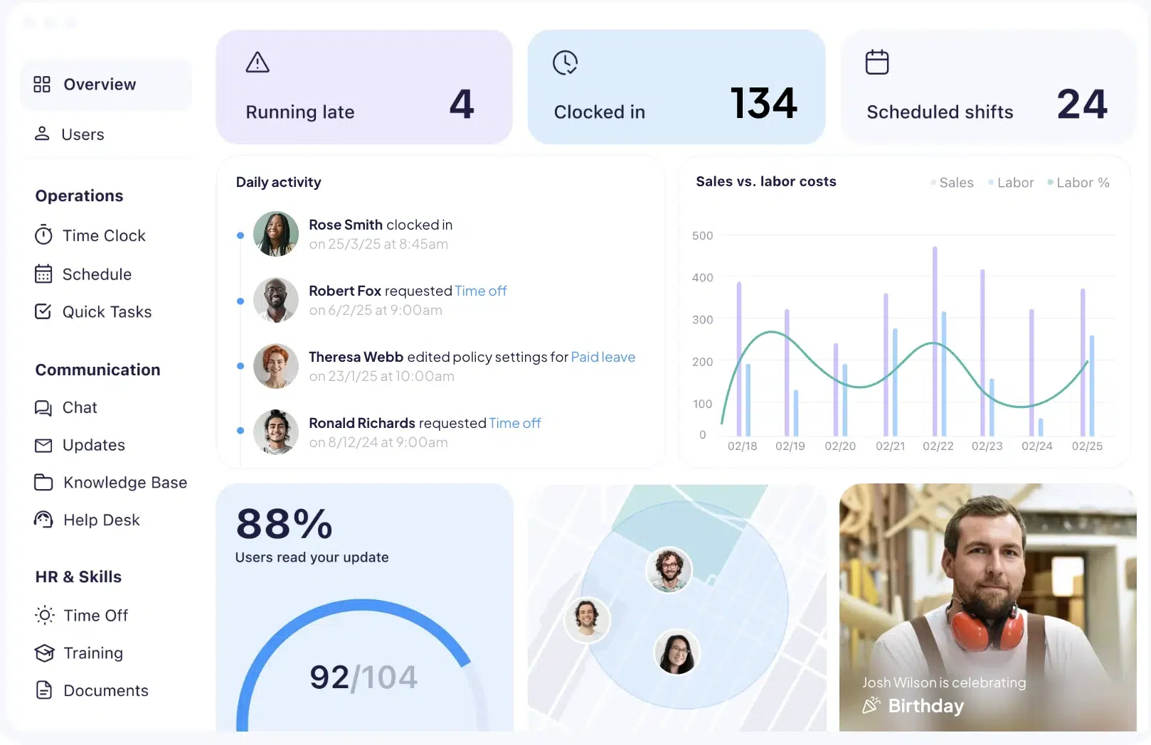 • All-in-one platform untuk absensi, shift, dan komunikasi tim.