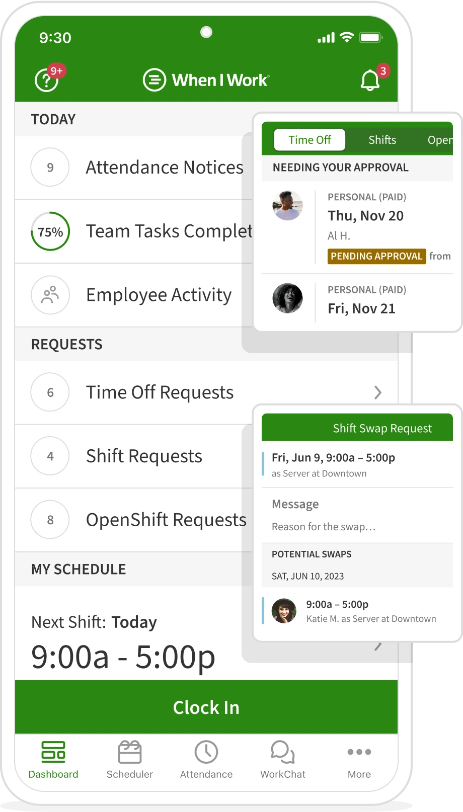 Bagi karyawan, When I Work menyediakan aplikasi absensi mobile terbaik berbasis cloud yang memungkinkan mereka untuk mengakses jadwal kerja, menerima pemberitahuan, dan mengirim permintaan perubahan jadwal atau cuti dengan mudah.