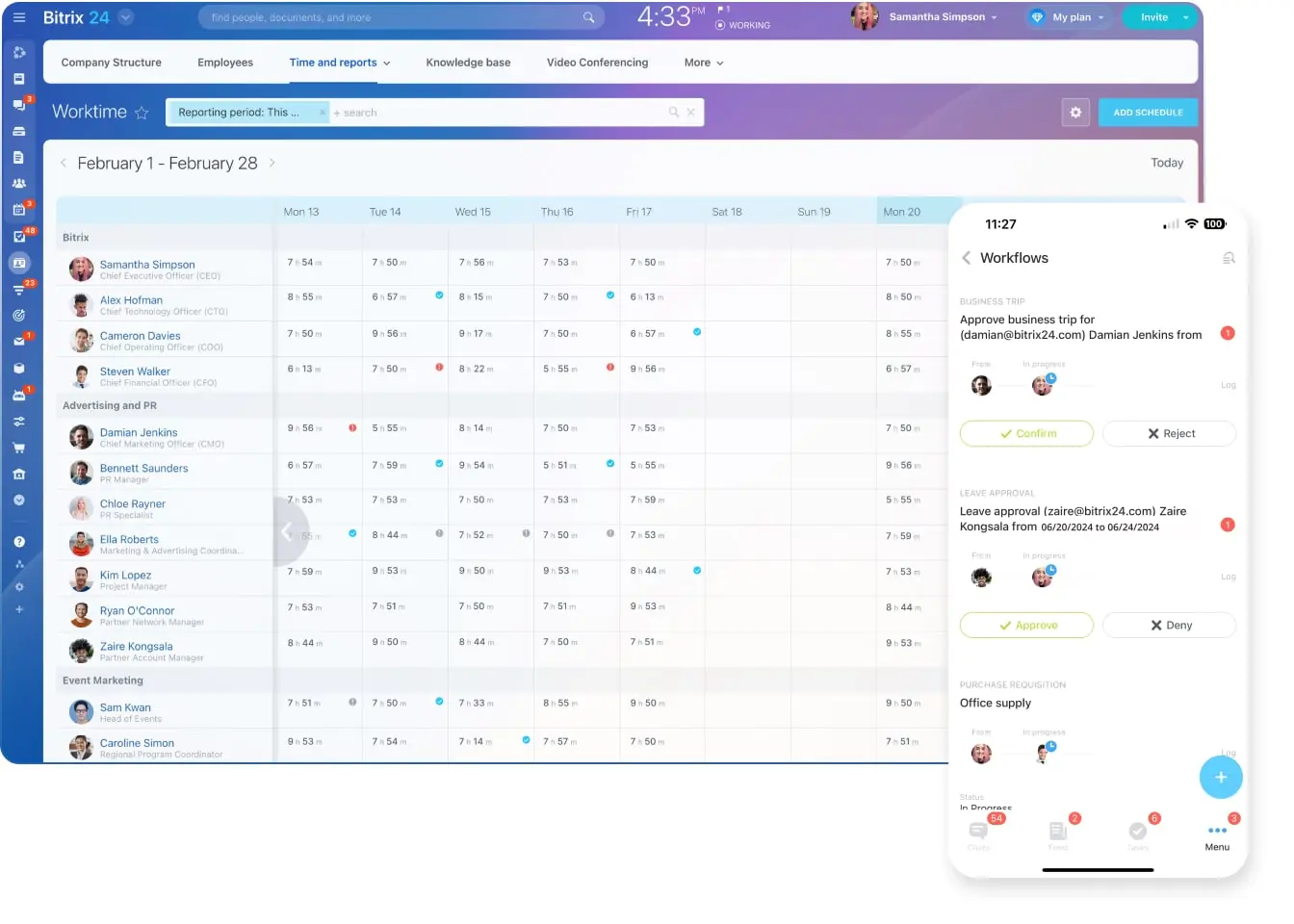 - Employee directory and time tracking.